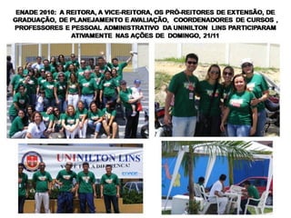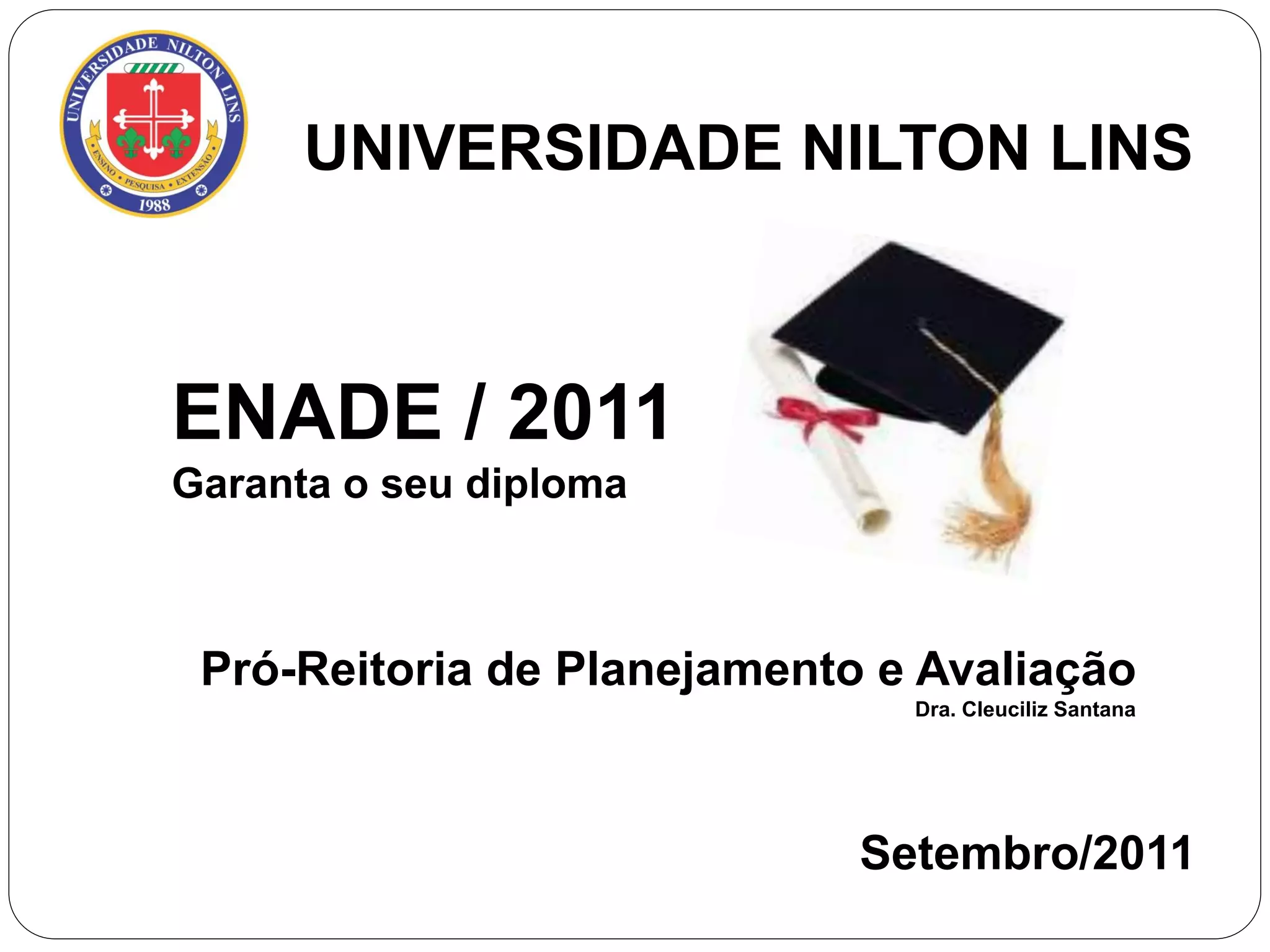 O documento fornece informações sobre o Exame Nacional de Desempenho de Estudantes (ENADE) de 2011, incluindo quais cursos serão avaliados, quem deve realizar a prova, formato da prova, data e local da aplicação. A Universidade Nilton Lins criou a campanha "ENADE: Eu vou fazer!" para apoiar os alunos na preparação para o exame e disponibiliza materiais informativos em seu blog.