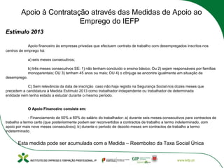 Este documento descreve vários programas de apoio ao emprego do IEFP em Portugal, incluindo: (1) Estímulo 2013 para apoiar contratos com desempregados; (2) Reembolso da Taxa Social Única para empregadores; (3) Estágio Emprego para estágios profissionais de jovens e desempregados.