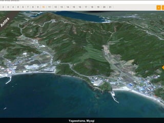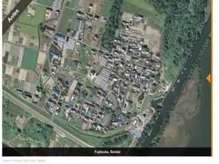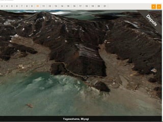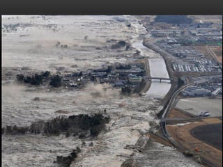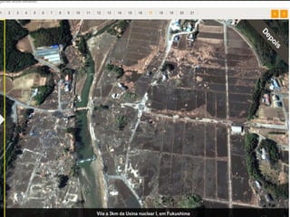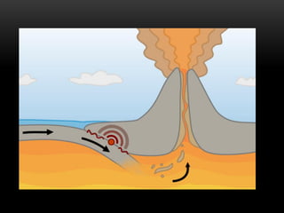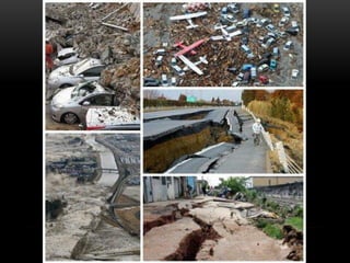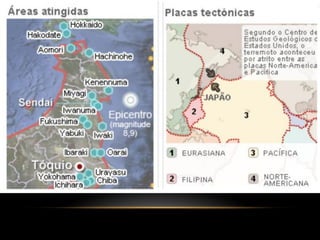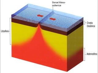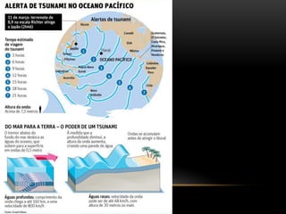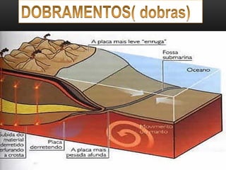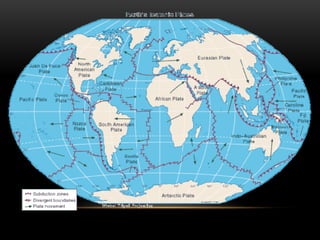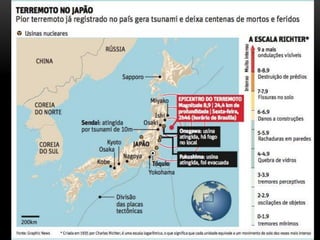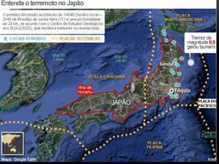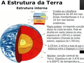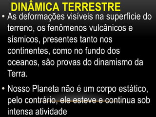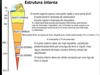 O documento descreve a estrutura interna da Terra, incluindo a crosta terrestre, litosfera e dinâmica terrestre. Ele também discute os limites de placas tectônicas, como zonas de subdução e falhas de transformação, e fornece exemplos como o terremoto e tsunami de 2011 no Japão.