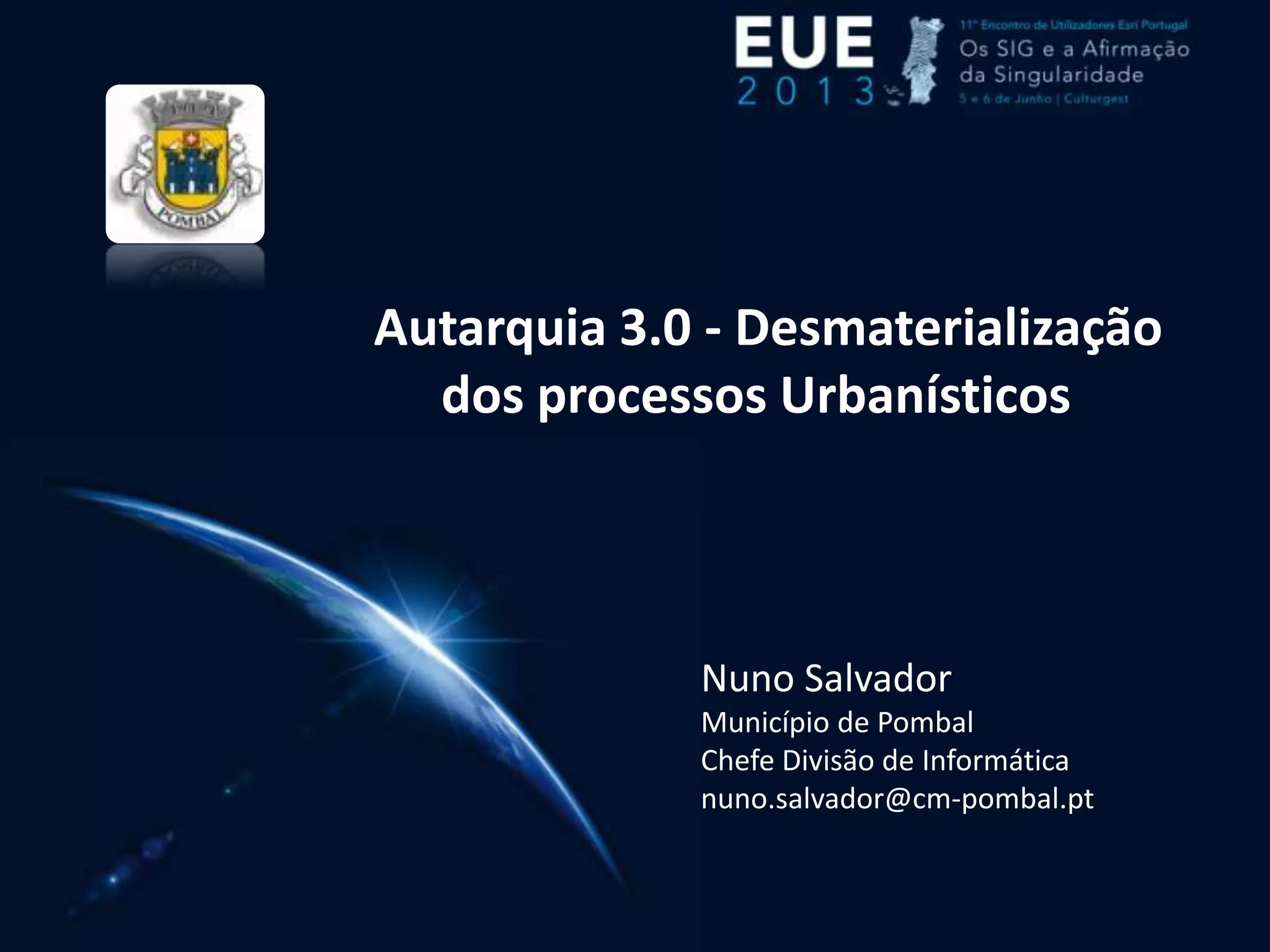 O documento discute o desenvolvimento do sistema WebSIGU para desmaterializar processos de urbanismo no município de Pombal. O WebSIGU permite a submissão online de pedidos, integração com sistemas GIS, geração automática de documentos e fluxos de trabalho digitais para agilizar e simplificar os processos de licenciamento. A plataforma utiliza tecnologias ESRI para facilitar a integração com sistemas de informação e otimizar recursos existentes.