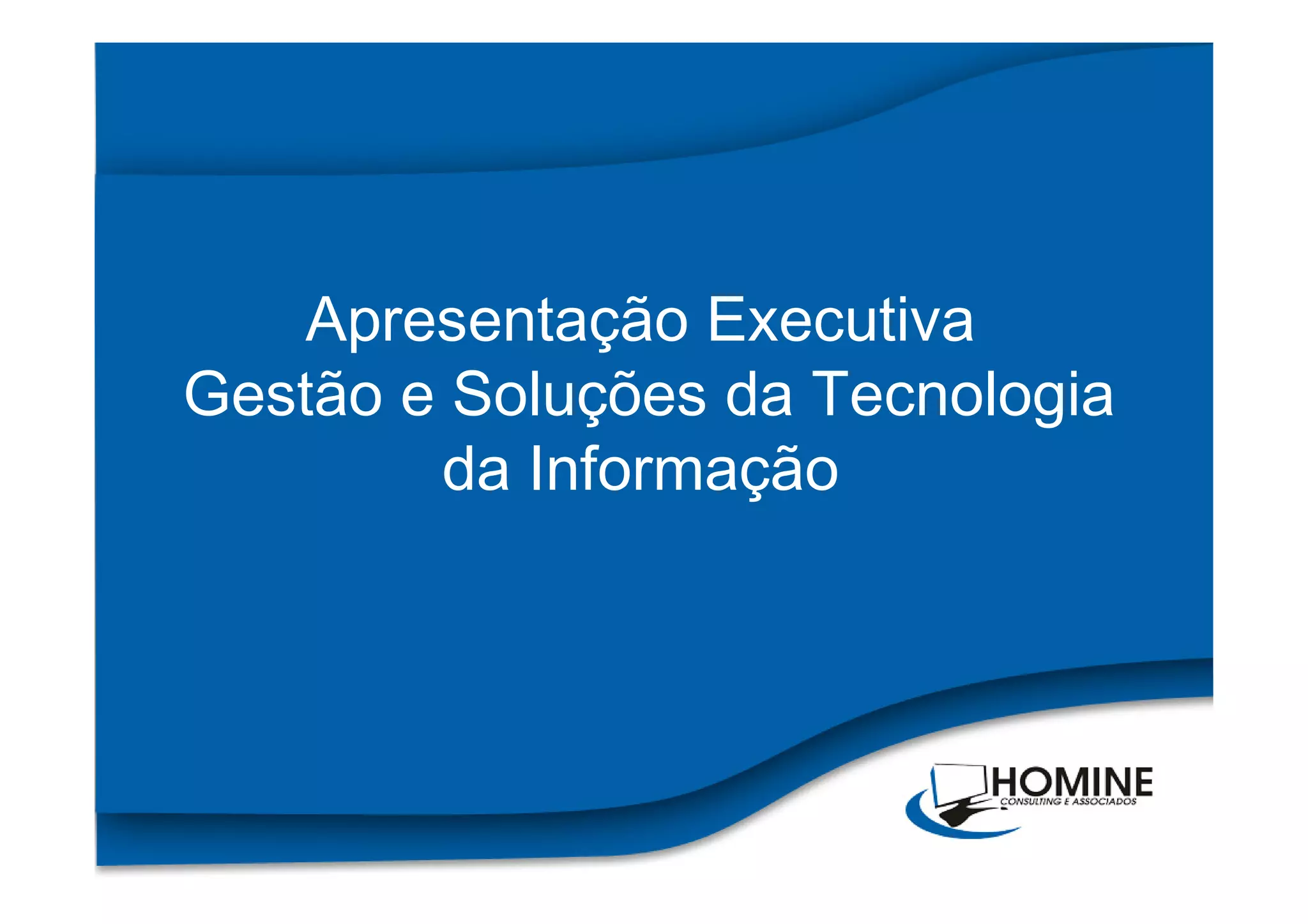 A apresentação executiva descreve os serviços e soluções de tecnologia da informação oferecidos pela empresa Homine, incluindo consultoria estratégica, fábrica de software, projetos SAP e soluções de documentos eletrônicos como nota fiscal eletrônica e conhecimento de transporte eletrônico.