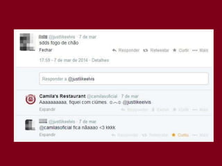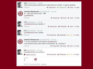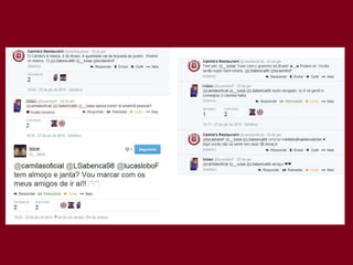 O documento discute a importância do diálogo humanizado nas redes sociais, especialmente no Twitter do Camila's Restaurant, para fortalecer relacionamentos com o público. Analisa os resultados quantitativos do aumento de seguidores e interações no Twitter após a adoção de estratégias de comunicação mais humana. Conclui que gerenciar comunicação digital requer dar importância aos usuários e interações contínuas para humanizar as marcas.