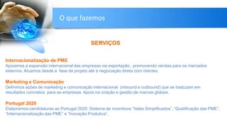Esta empresa oferece serviços de internacionalização para pequenas e médias empresas, incluindo o desenvolvimento de estratégias de exportação, marketing internacional, candidaturas a fundos europeus e apoio direto na negociação com clientes estrangeiros.