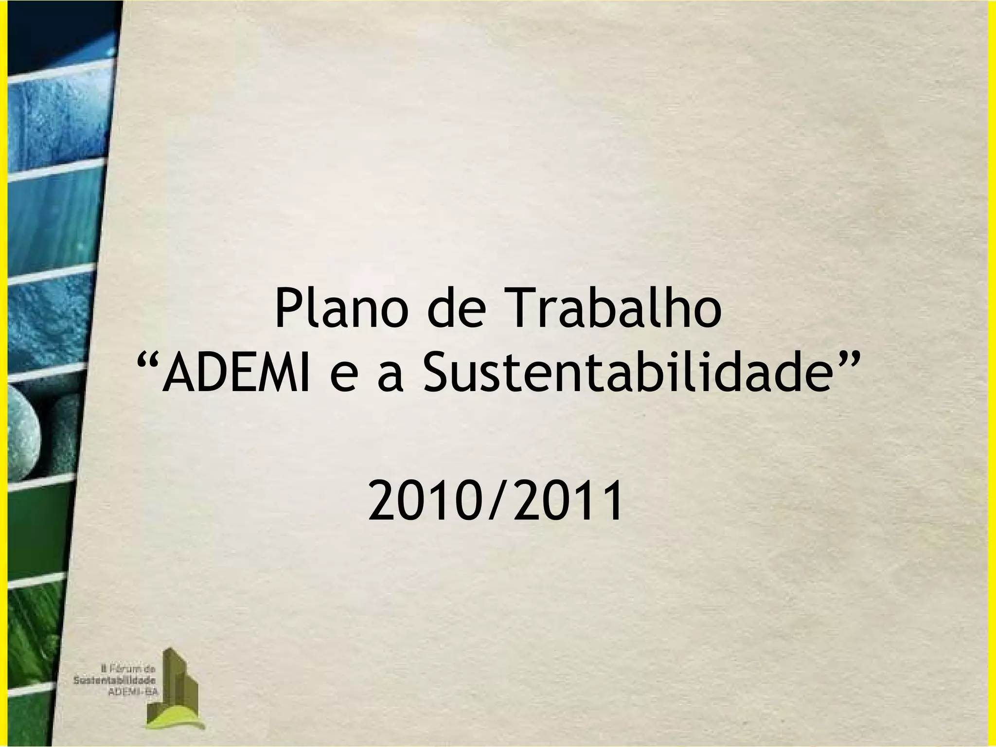 1) O documento apresenta o Plano de Trabalho "ADEMI e a Sustentabilidade" para 2010/2011, com objetivos, conceitos, projetos e ações relacionados à sustentabilidade.