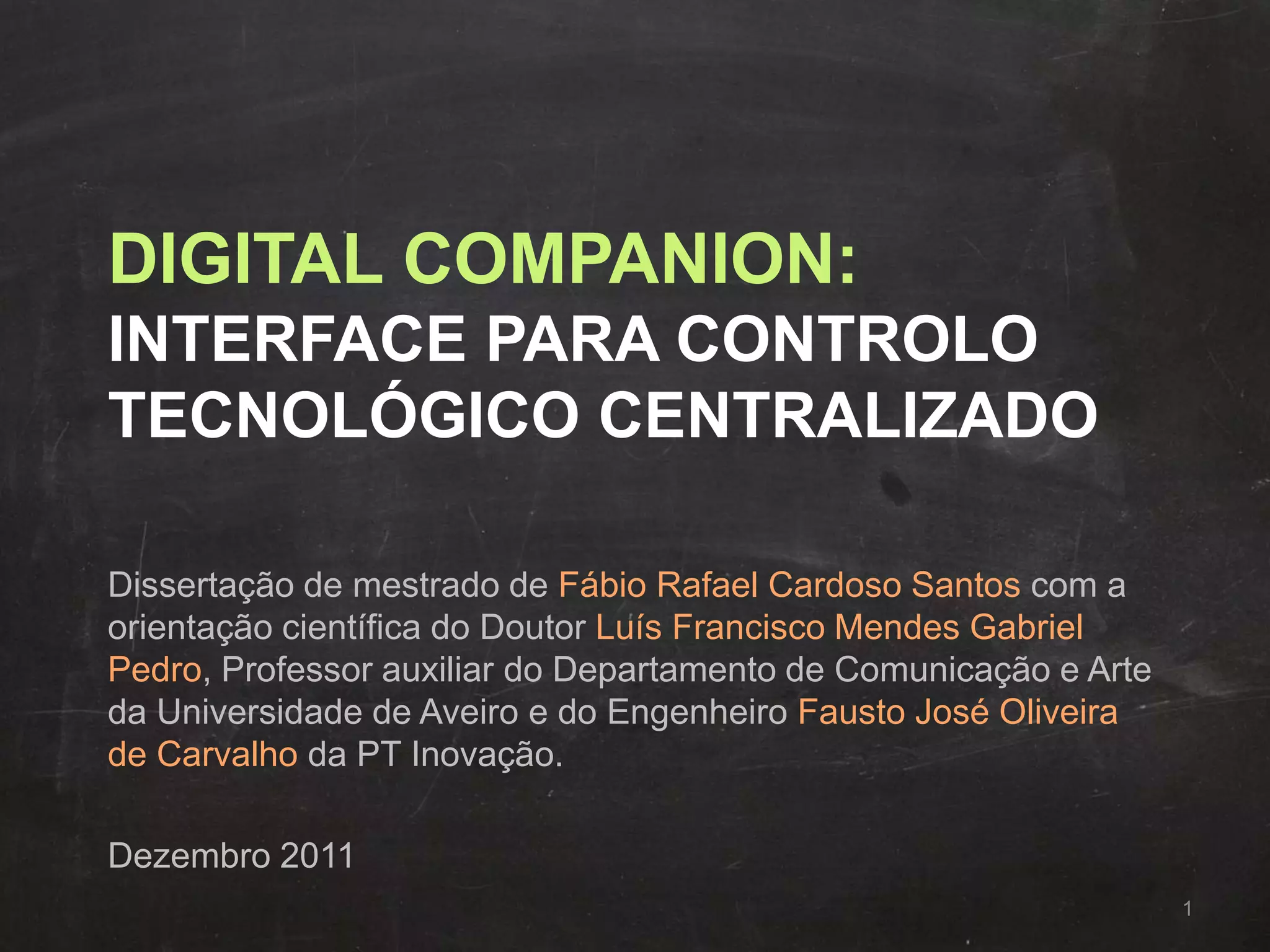 Este documento resume uma dissertação de mestrado sobre o desenvolvimento de um protótipo de interface para um tablet que permite o controle centralizado de tecnologias domésticas de forma simples e intuitiva. O documento descreve a caracterização do problema, os objetivos, a metodologia, o desenvolvimento do protótipo, a avaliação com usuários e os resultados, concluindo que o tablet é um dispositivo promissor para este tipo de controle e que a interface desenvolvida foi bem avaliada.