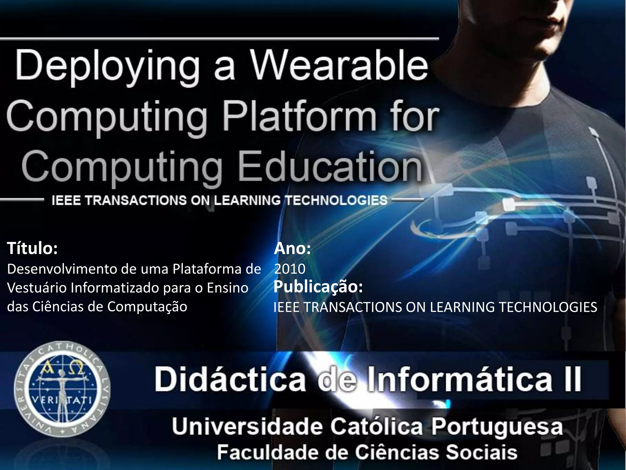Este documento descreve uma plataforma de vestuário informatizado desenvolvida para ensinar ciências da computação. A plataforma consiste em hardware, software e um workshop de aprendizagem. Os testes mostraram que a plataforma captou a atenção dos alunos e os ajudou a superar dificuldades como programação.