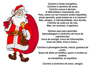 O documento discute a importância do carinho e afeto entre alunos e amigos. Ele afirma que o carinho é fonte de energia, amor e caminho para a troca de experiências positivas. O texto deseja um Feliz Natal e um Próspero Ano Novo aos alunos do 1o Segmento do CAAM, agradecendo pela união e companheirismo durante o ano letivo.