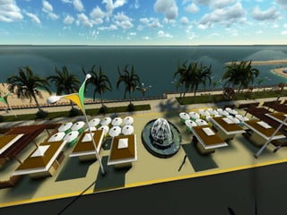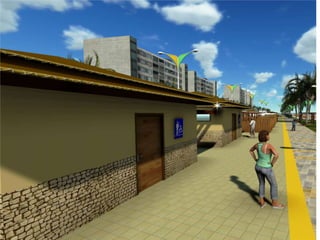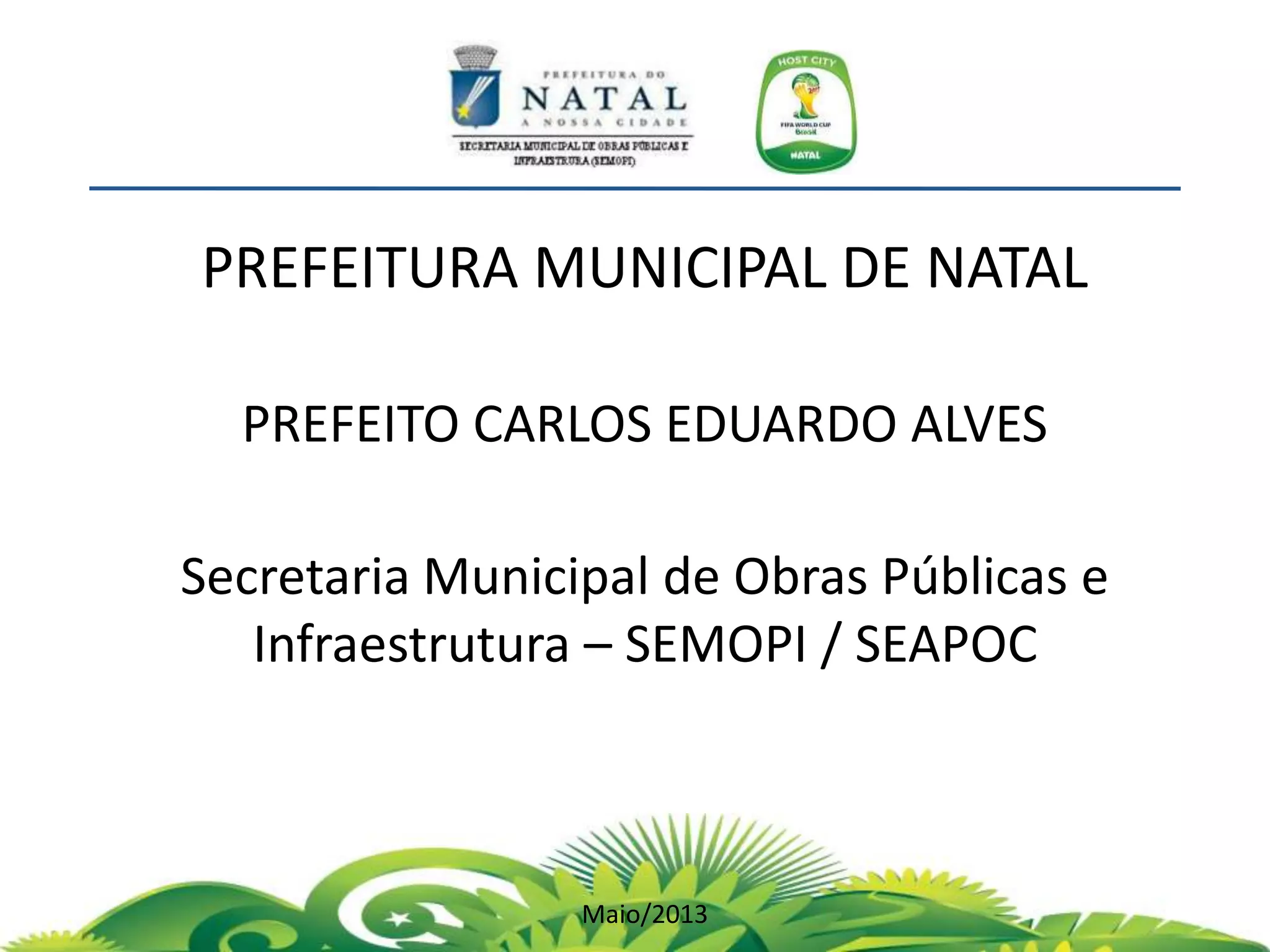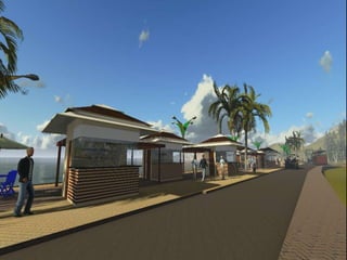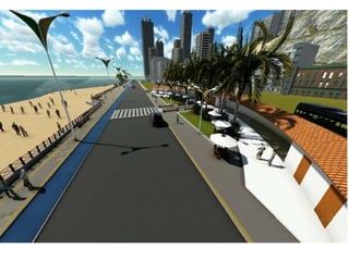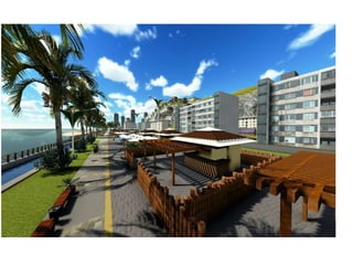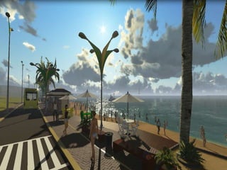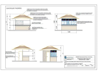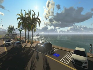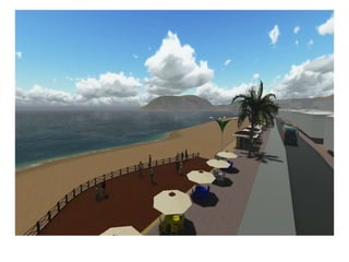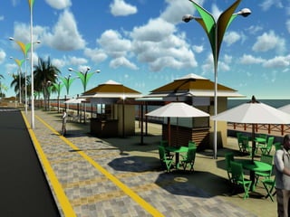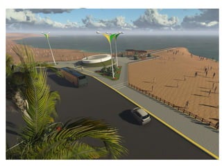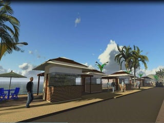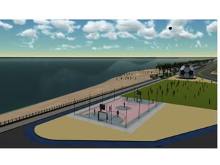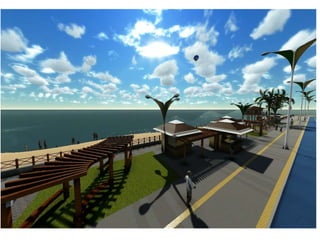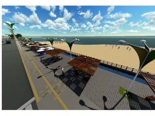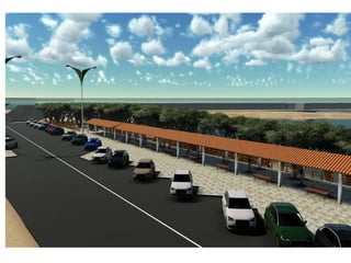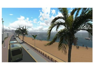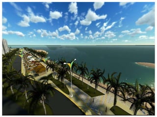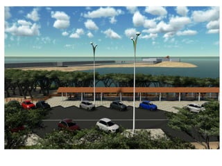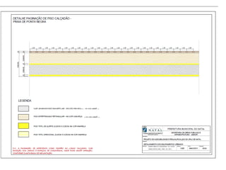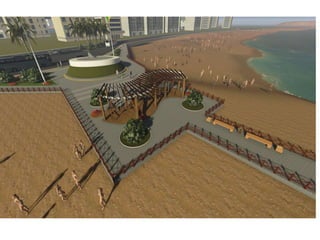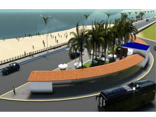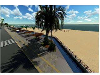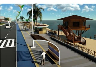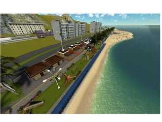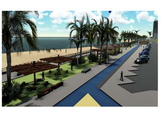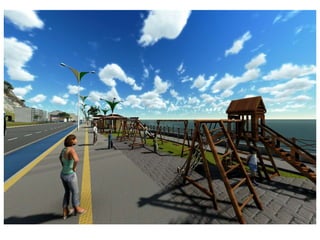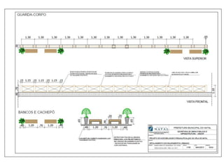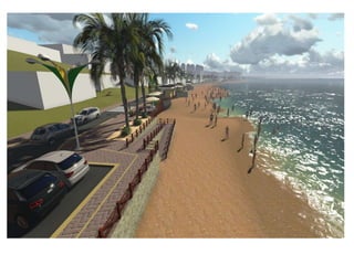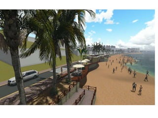 O documento descreve propostas para a reestruturação da orla urbana de Natal visando a Copa do Mundo de 2014. O projeto inclui a adequação de acessibilidade na orla de Areia Preta, Praia do Forte e Ponta Negra, com equipamentos urbanos como quiosques, banheiros e áreas de lazer. Serão realizadas intervenções em três trechos ao longo da orla para promover acessibilidade, qualificação dos espaços e consolidação do corredor turístico.