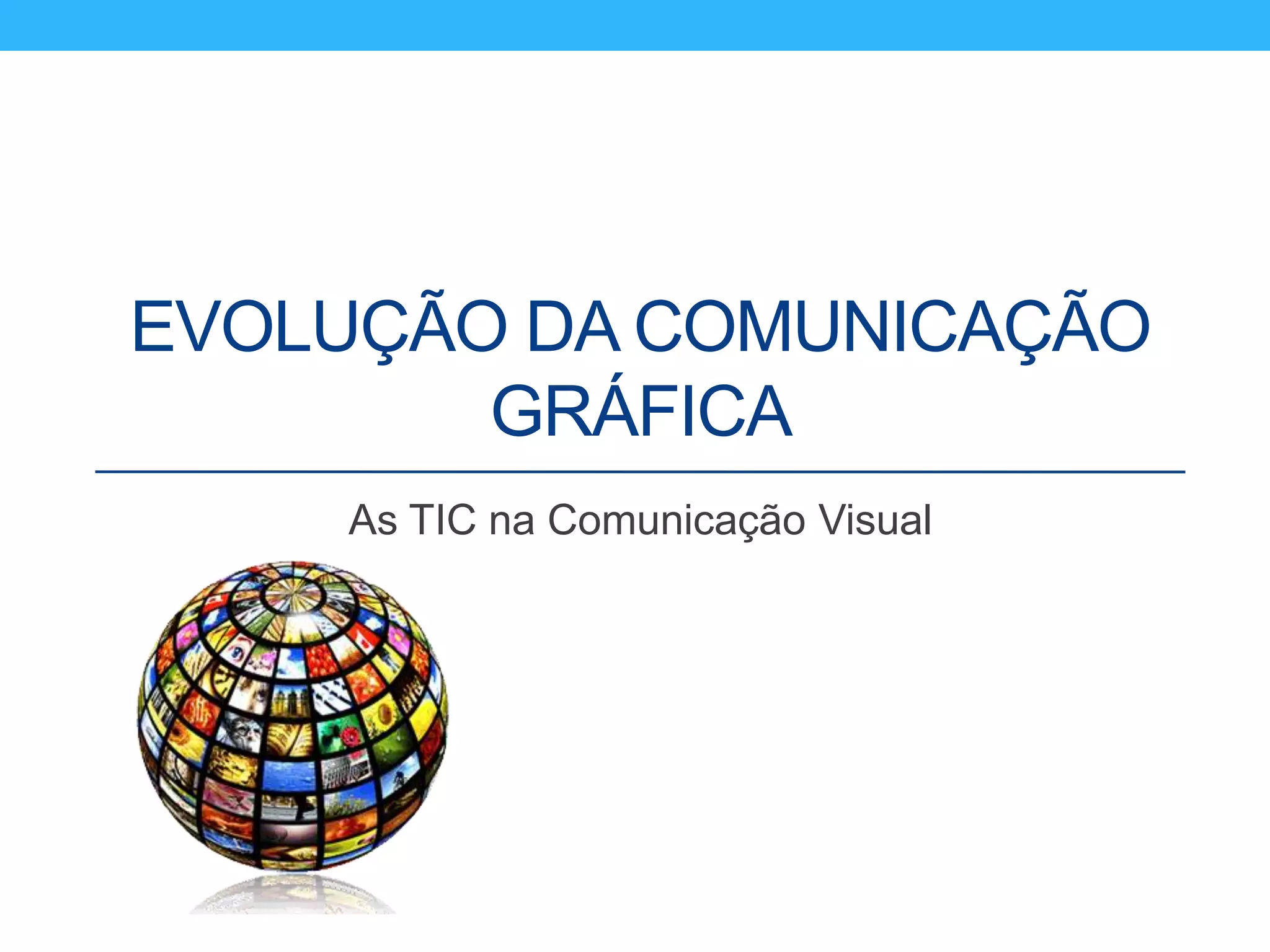 O documento discute a evolução da comunicação gráfica, desde as pinturas rupestres até a introdução das tecnologias digitais. Aborda conceitos como comunicação visual e gráfica, a invenção da imprensa, a evolução da cor na impressão e exemplos históricos como a Coca-Cola e cartazes de recrutamento. Também explica processos de produção, sistemas de impressão e softwares usados atualmente.