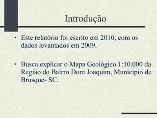 O documento apresenta um relatório geológico sobre a região do Bairro Dom Joaquim em Brusque, Santa Catarina. Descreve a geologia local, incluindo rochas metamórficas do Complexo Brusque e granitos da Suíte Valsungana, além de quatro fases de deformação e metamorfismo regional. Também discute a evolução geológica da bacia sedimentar e implicações ambientais e econômicas da área.