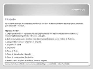 O documento descreve o planeamento de um projeto multimédia chamado InovaUA realizado por quatro estudantes ao longo de um semestre. Inclui a organização da equipa, requisitos funcionais, planeamento, testes, manutenção, lançamento e uma análise crítica do progresso do projeto.