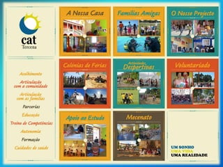 [1] O documento descreve o Centro de Alojamento Temporário de Tercena, um lar para crianças e jovens em risco. [2] A casa acolhe crianças em situações de abandono, maus-tratos ou desintegração familiar. [3] O projeto Famílias Amigas coloca algumas crianças em famílias de acolhimento temporário ou definitivo, como adoção.