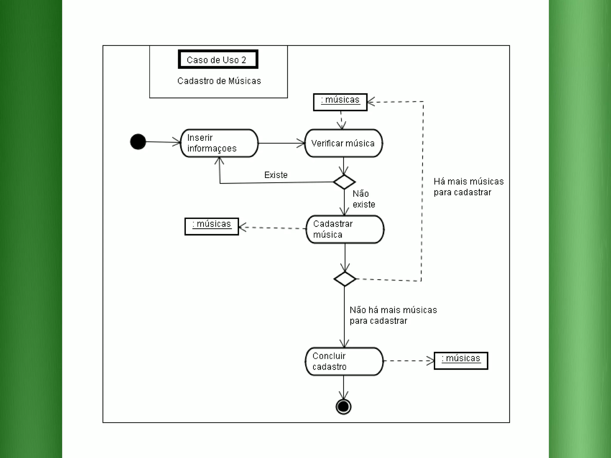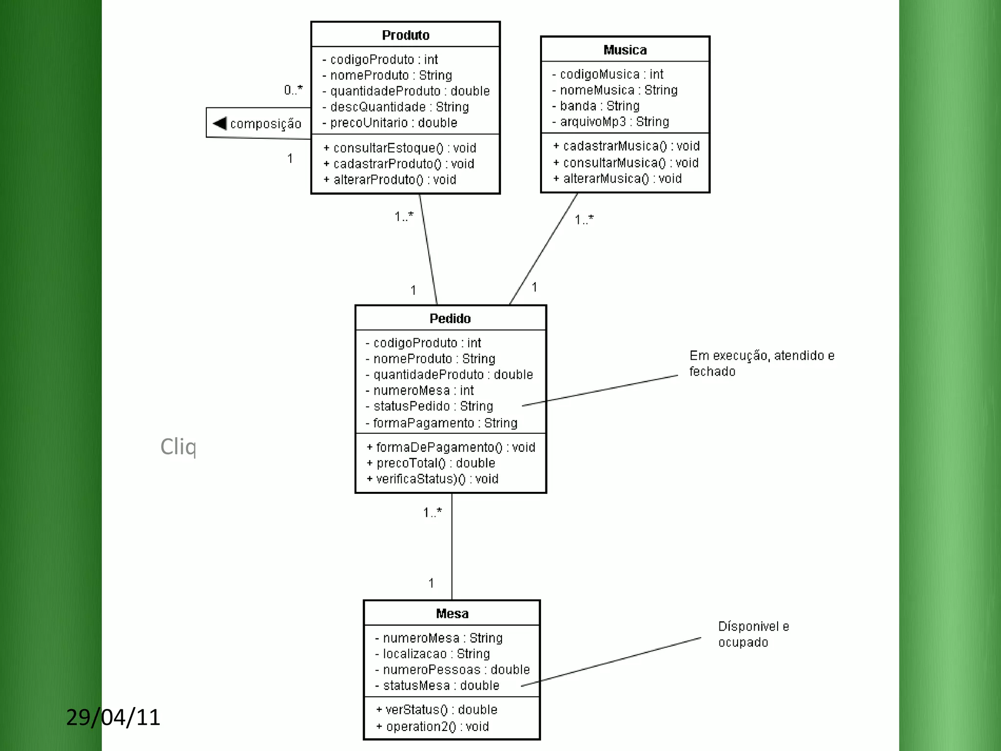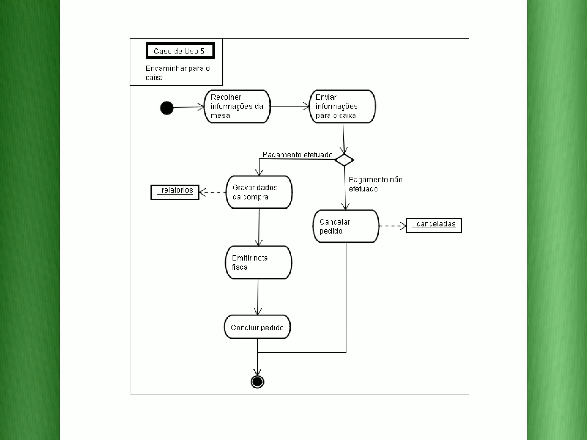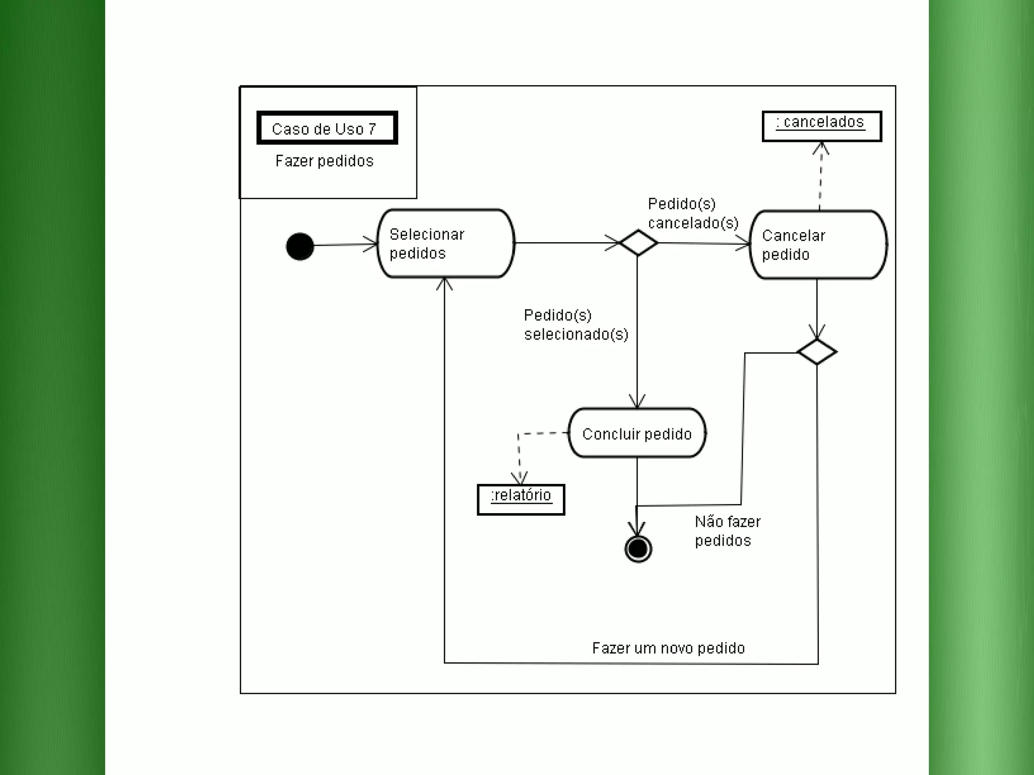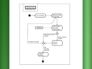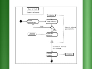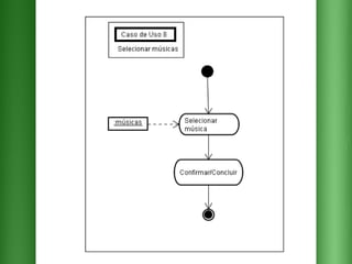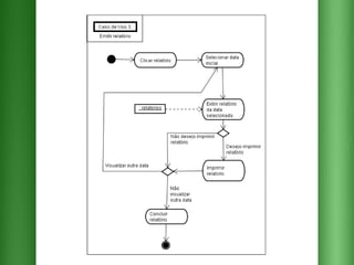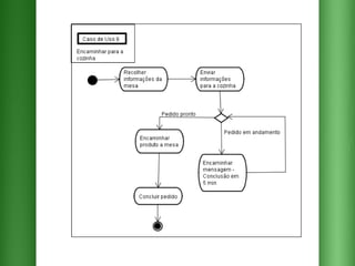 O documento descreve os requisitos para um sistema de pedidos em um restaurante com as seguintes funcionalidades essenciais: 1) cadastrar e selecionar produtos e músicas; 2) emitir relatórios de pedidos por dia e mês; 3) encaminhar pedidos para a cozinha e o valor total para o caixa.