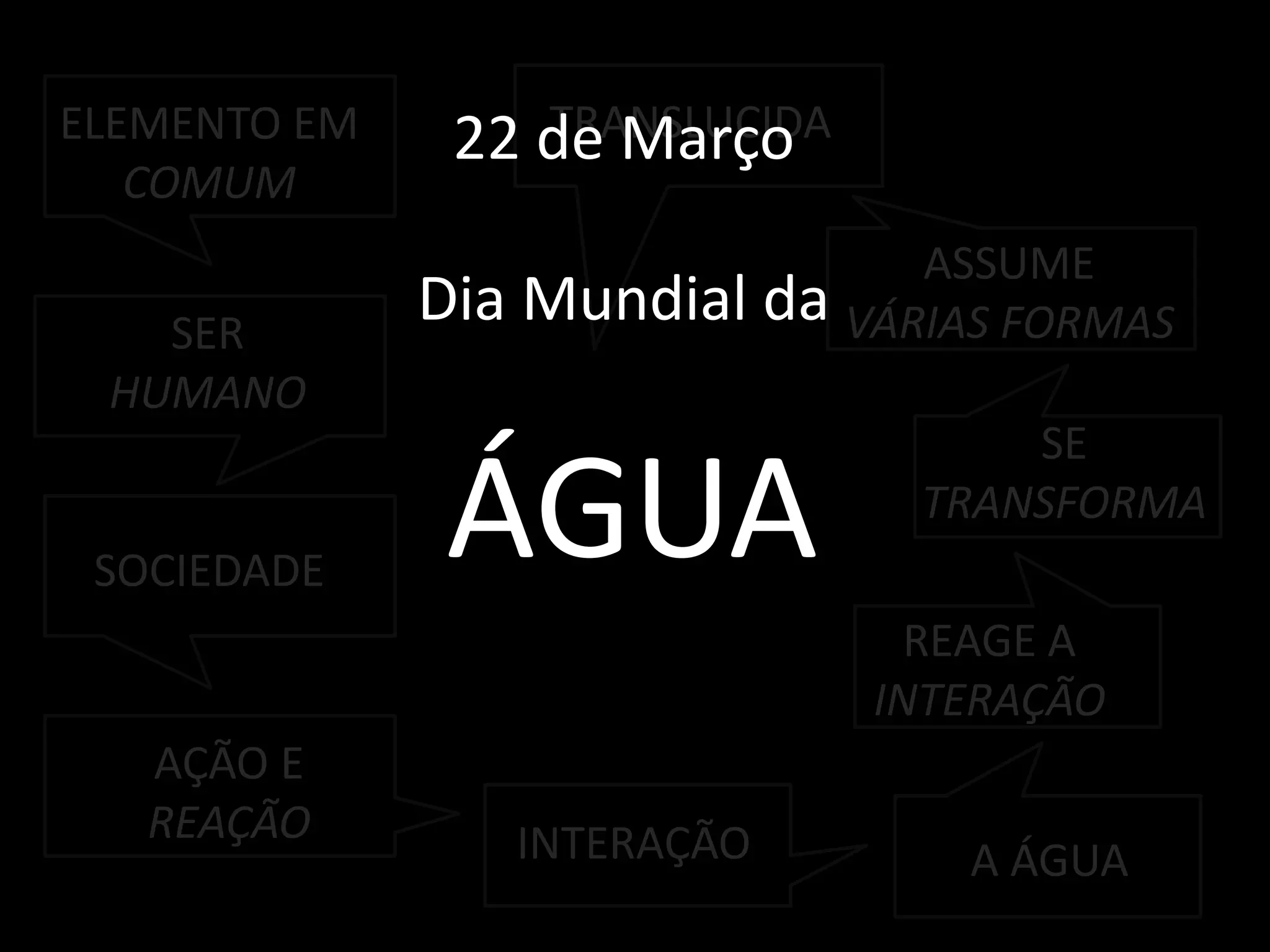 O documento discute como os seres humanos interagem em sociedade e como a água reage às interações, assumindo várias formas. A data de 22 de março é o Dia Mundial da Água.