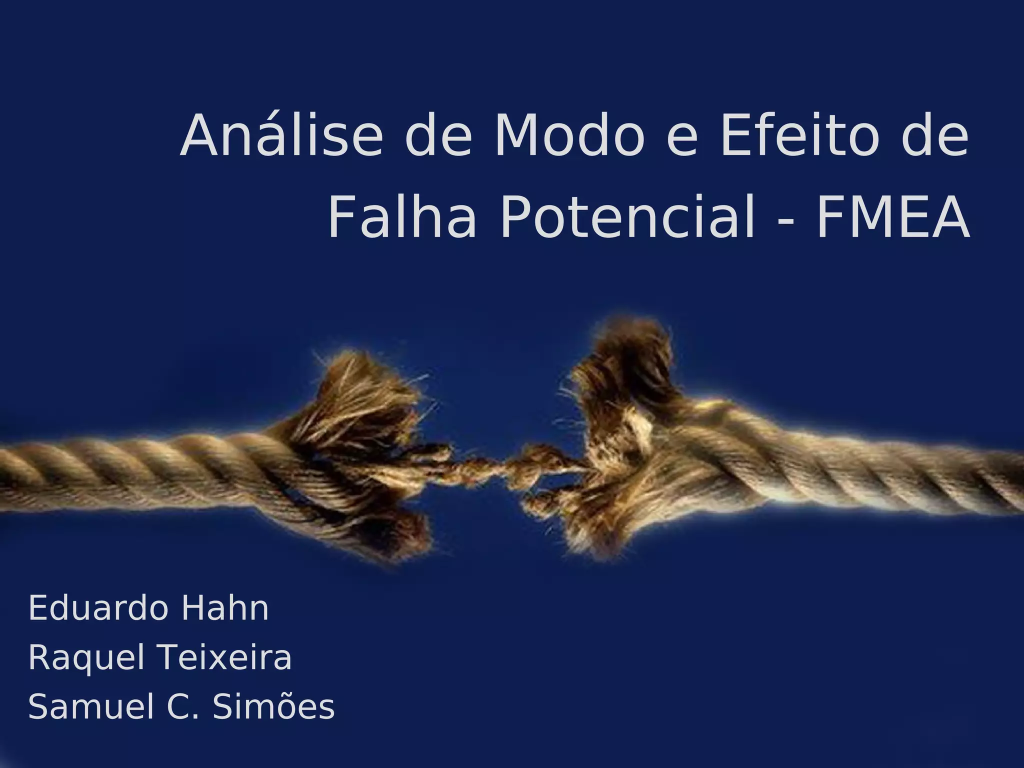 O documento apresenta uma análise de falhas potenciais e seus efeitos (FMEA) para avaliar riscos em projetos e processos. Ele descreve o que é FMEA, como implementá-lo identificando falhas, efeitos e ações corretivas, além de explicar os tipos de FMEA (projeto e processo) e como aplicá-los.