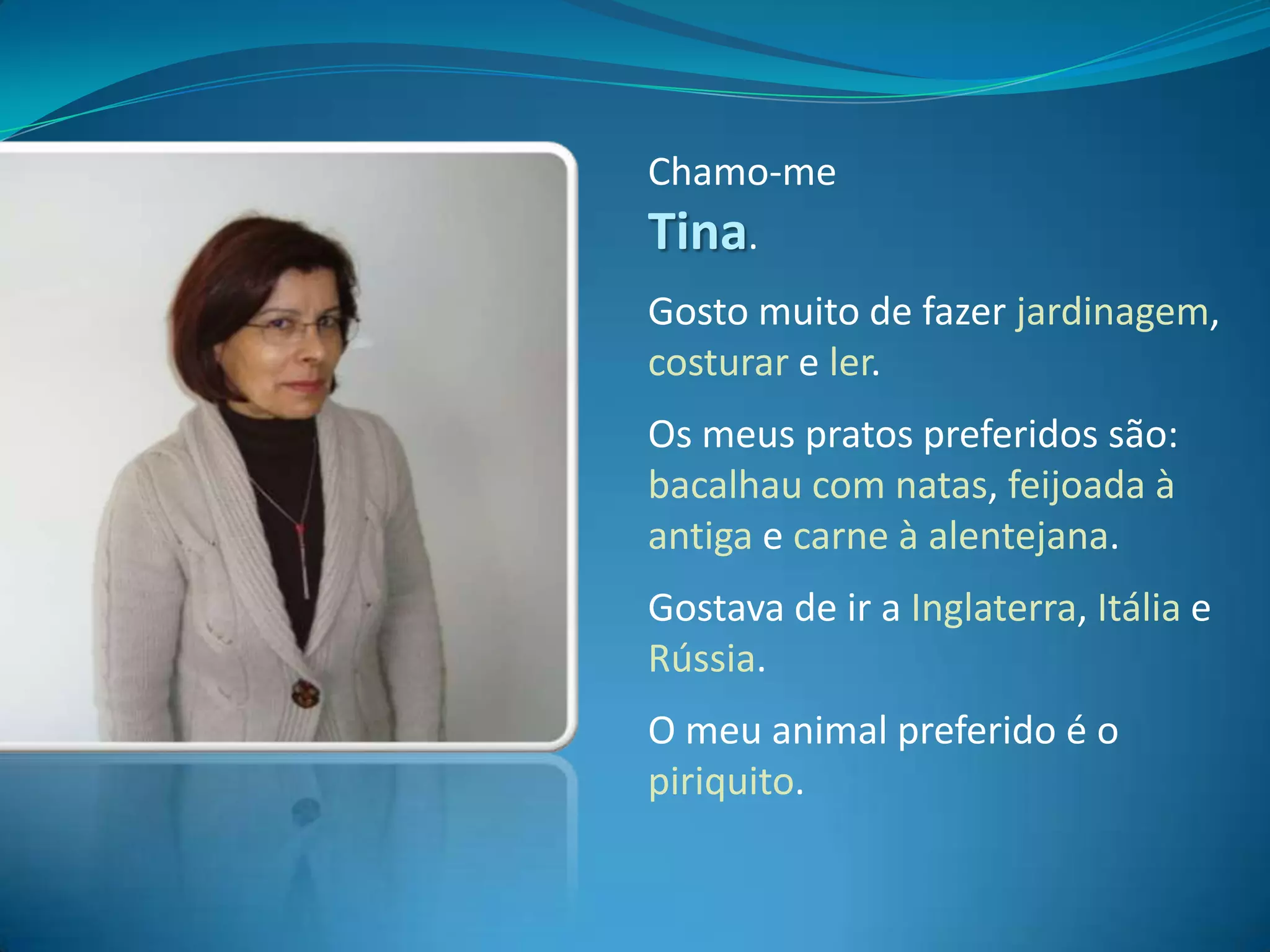 Este documento apresenta as informações pessoais de várias pessoas, incluindo seus nomes, hobbies, pratos de comida preferidos, locais que gostariam de visitar e animais favoritos. Muitos gostam de cozinhar, dançar, estar com a família e amigos. Pratos populares incluem bacalhau, cozido português e carne alentejana. Locais comumente desejados são Brasil, Cabo Verde e Itália. Cães e gatos são os animais favoritos mais citados.