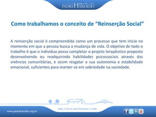 O documento discute a reinserção social de indivíduos que buscam mudança de vida, definindo-a como um processo que começa com a busca por mudança e tem como objetivo desenvolver habilidades para manter a sobriedade na sociedade. Também lista conquistas esperadas como disciplina, responsabilidade e autoestima, e referências para avaliação do progresso como apresentação pessoal e documentação.