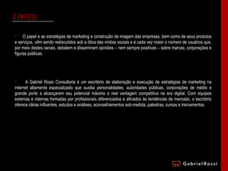 A Gabriel Rossi Consultoria é uma empresa especializada em estratégias de marketing digital que auxilia empresas e figuras públicas a alcançarem seu potencial máximo na era digital. A empresa oferece serviços como marketing político digital, pesquisa qualitativa em redes sociais, gestão de crise e reputação online. Seu fundador Gabriel Rossi é reconhecido como uma autoridade em marketing digital no Brasil.