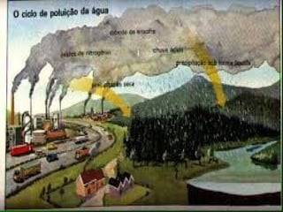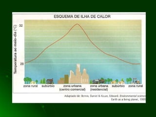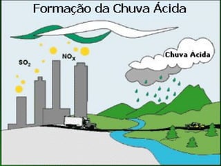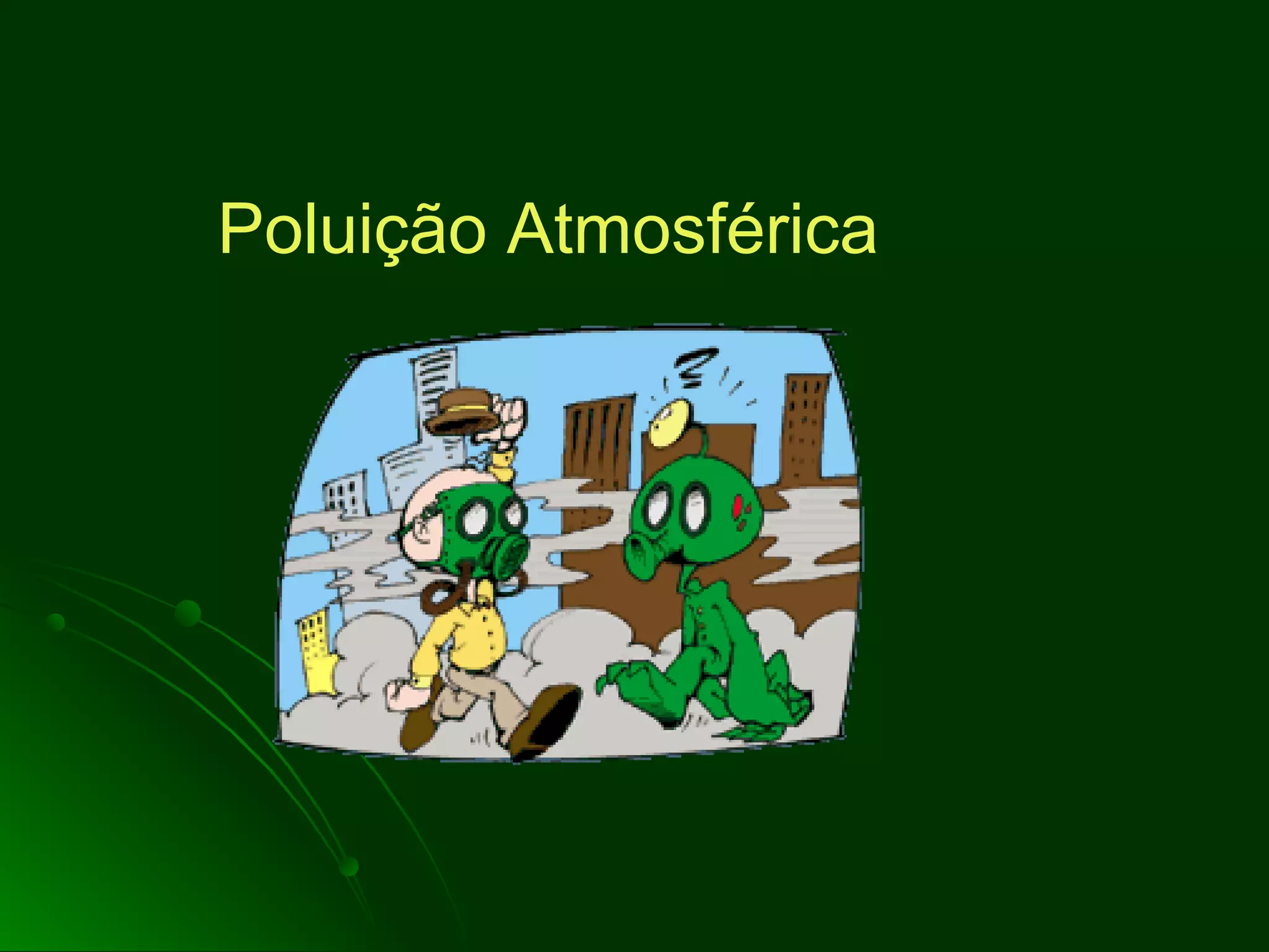 A poluição atmosférica pode ser causada por fontes naturais como vulcões e incêndios florestais, mas principalmente por atividades humanas como queima de combustíveis fósseis em veículos, indústrias e usinas termoelétricas. Isso libera gases que formam chuva ácida e causam problemas de saúde. Além disso, grandes cidades sofrem com o fenômeno da inversão térmica, que retém poluentes e agrava os efeitos da poluição.