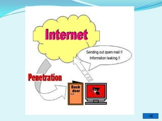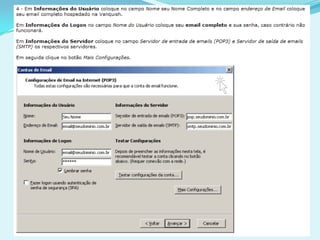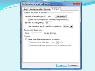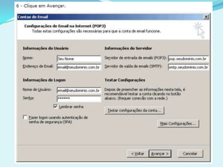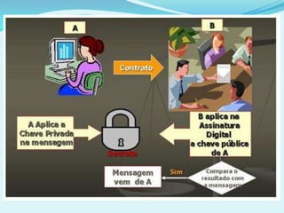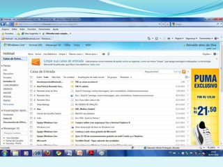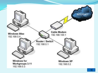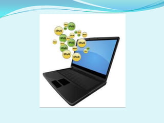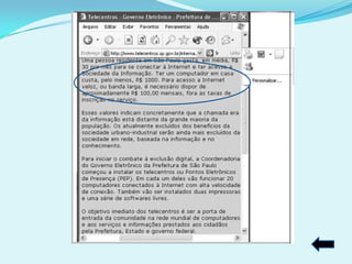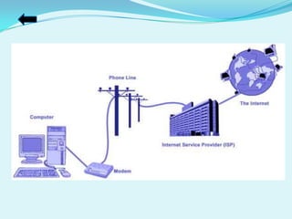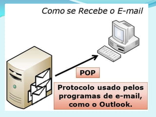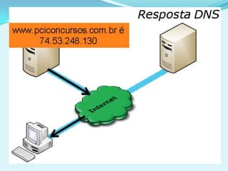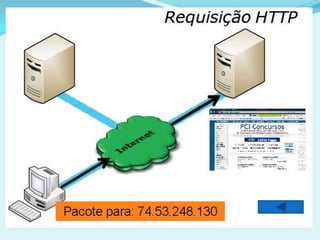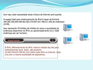 O documento discute os principais protocolos e formas de conexão à internet, incluindo protocolos como IP, DNS e HTTP. Também aborda tecnologias de acesso como DSL, cabo e 3G.