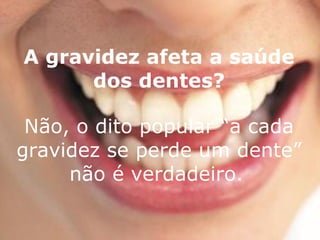 Este documento discute como a gravidez afeta a saúde bucal e dentária. Embora a gravidez não cause problemas nos dentes diretamente, as alterações hormonais podem aumentar a inflamação gengival já existente. A gestante também corre maior risco de cáries devido ao aumento no consumo de alimentos açucarados. Manter hábitos saudáveis de alimentação e higiene bucal durante a gravidez é importante para a saúde da mãe e do bebê.