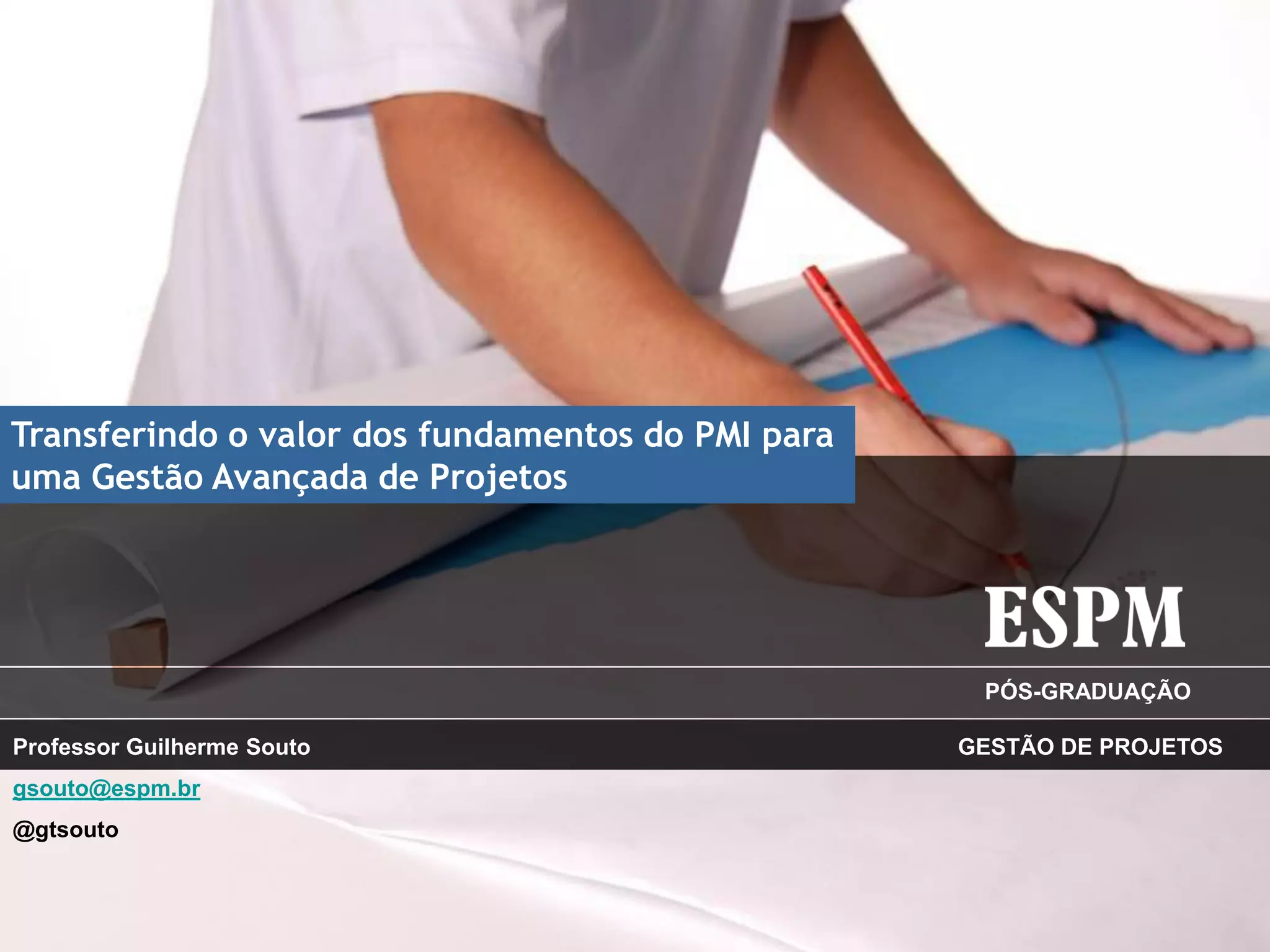 O documento discute a gestão do conhecimento e como transferir o valor dos fundamentos do PMI para uma gestão avançada de projetos. Ele define gestão do conhecimento e explica como pode ser usada para atingir a excelência organizacional, minimizando conhecimento tácito e maximizando conhecimento explícito por meio de lições aprendidas, programas de treinamento e gestão por competências.