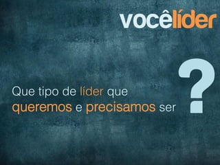 O documento discute os tipos de líderes necessários e como cultivar relacionamentos e inspirar equipes. Ele enfatiza que os líderes devem focar no time e nos outros, não em si mesmos, e devem estabelecer influência, cultivar relacionamentos e inspirar suas equipes através do comprometimento com objetivos compartilhados e valores comuns.