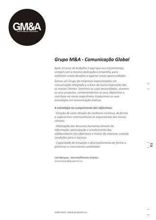 Este documento apresenta as várias empresas do Grupo M&A, especializadas em comunicação integrada, e os serviços que fornecem, incluindo design gráfico, fotografia, desenvolvimento web, vídeo e impressão. O documento também inclui estudos de caso de projetos realizados para clientes do setor vinícola.