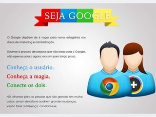 O documento descreve a história da fundação do Google por Larry Page e Sergey Brin na Universidade Stanford, seu rápido crescimento nos anos 2000, suas diversas sedes em mais de 40 países e sua sede principal em Mountain View, Califórnia. O documento também propõe a criação de um reality show para selecionar candidatos para o Google no Brasil.