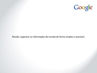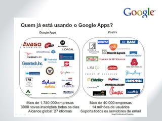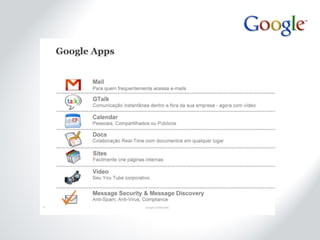 A Google visa organizar informações do mundo de forma acessível e conta com mais de 21 mil funcionários globalmente. O Google Apps, lançado em 2007, é uma plataforma de comunicação e colaboração que oferece serviços gratuitos para escolas e organizações, além de recursos avançados para usuários premium. A empresa investe continuamente em melhorias de seus algoritmos de busca e inovações em tempo real, garantindo segurança e funcionalidades modernas.