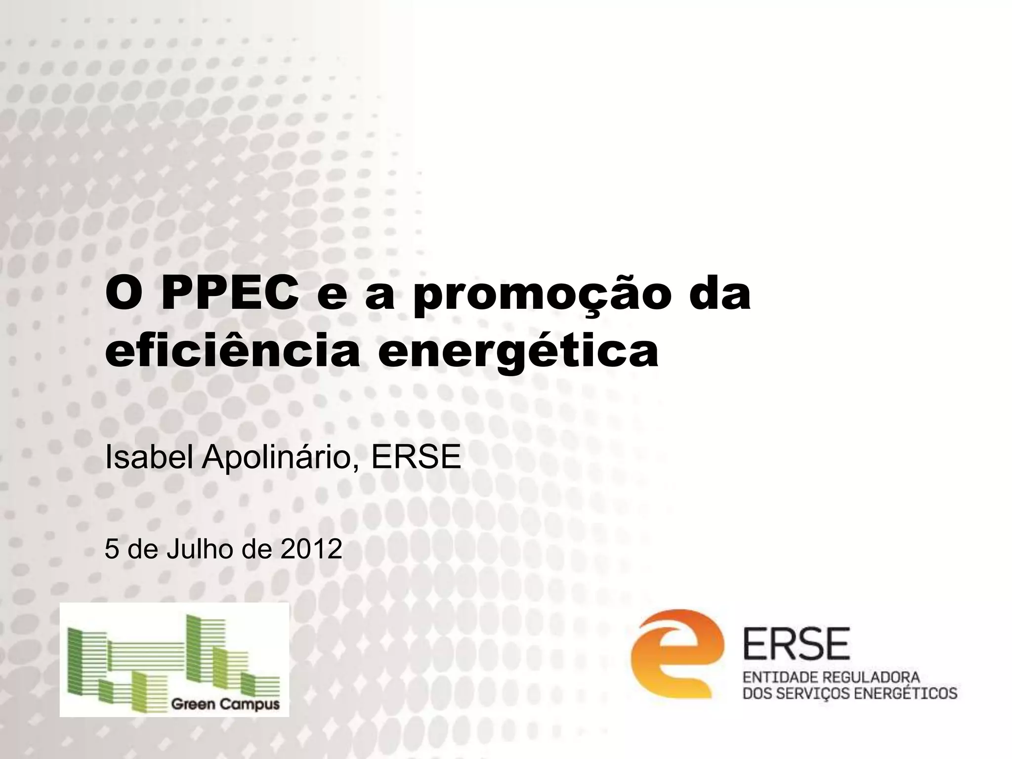 O documento discute a importância da eficiência energética e do Plano de Promoção da Eficiência no Consumo (PPEC) estabelecido pela Entidade Reguladora dos Serviços Energéticos. O PPEC financia medidas para promover hábitos de consumo mais eficientes. O documento destaca que o PPEC envolve vários agentes e que as medidas aprovadas podem reduzir o consumo em 1,2% e as emissões de carbono.