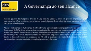 O documento apresenta uma proposta de adoção de um modelo de governança de TI baseado no COBIT, visando elevar os níveis de maturidade e melhorar a satisfação dos clientes. A atuação da consultoria inclui a análise de necessidades, implementação de soluções e avaliação de riscos, além de capacitação de equipes. Os resultados esperados incluem diminuição de riscos, aumento da disponibilidade do ambiente e atendimento a conformidades e auditorias.