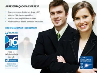 A Guia-se é uma empresa fundada em 1997 que oferece serviços de marketing digital como criação de sites e lojas virtuais. Sua missão é gerar felicidade através de negócios pela internet e sua visão é se tornar a melhor rede de franquias do Brasil até 2020. A empresa ajuda empresas de todos os portes a crescerem por meio de estratégias de marketing digital.
