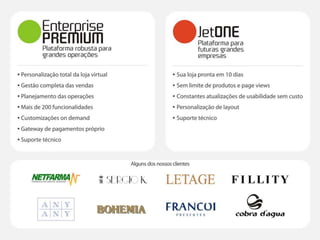 A Jet E-commerce, atuando no mercado desde 1997, é uma das principais plataformas de e-commerce no Brasil, com mais de 300 clientes e uma equipe altamente capacitada. A empresa oferece soluções completas para vendas online, focando na inovação e na evolução constante de ferramentas. Entre os benefícios estão mensalidades acessíveis, ações de marketing integradas e uma rede de parceiros que potencializam os negócios dos clientes.