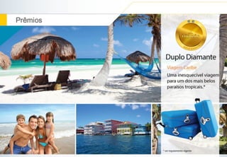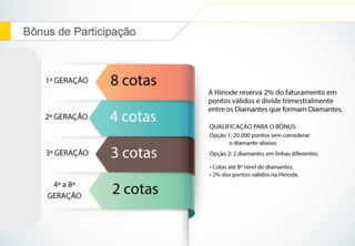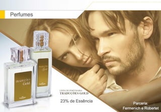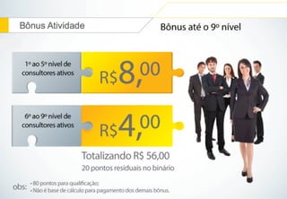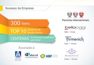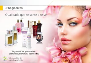 A empresa atua há 27 anos no mercado de vendas diretas, oferecendo oportunidades de renda para 4,33 milhões de pessoas no Brasil, com um faturamento de R$ 50 bilhões em 2014. Com uma fábrica própria e baixo risco de investimento, os representantes podem gerar renda significativa por meio da venda de produtos, como perfumes. O documento descreve modelos de ganhos e bônus disponíveis para os participantes do sistema, incentivando a construção de equipes e o alcance de metas.