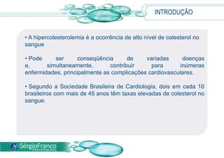 A hipercolesterolemia ocorre quando há alto nível de colesterol no sangue, podendo ser causada por fatores genéticos ou de estilo de vida. Ela geralmente não causa sintomas, mas aumenta o risco de doenças cardíacas. O diagnóstico é feito por exames de sangue e o tratamento envolve mudanças no estilo de vida e em alguns casos medicamentos.