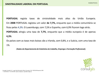 Portugal tem altas taxas de sinistralidade laboral comparado à União Europeia. Em 2008, a taxa de Portugal foi de 7,7% enquanto a média da UE foi de 4,3%. Globalmente, cerca de 2 milhões de pessoas morrem a cada ano devido a acidentes ou doenças relacionadas ao trabalho. O documento discute a importância da prevenção, segurança e formação para mudar comportamentos e reduzir acidentes.