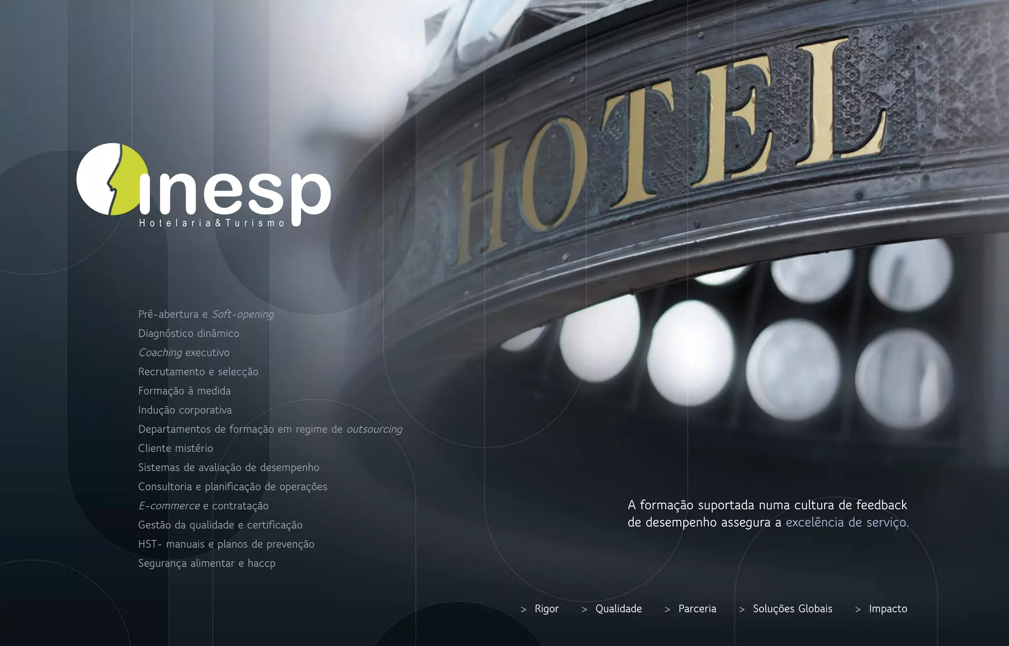 O documento descreve os serviços de formação e consultoria em hotelaria e turismo oferecidos pela INESP, incluindo pré-abertura, formação à medida, coaching, avaliação de desempenho, recrutamento, segurança alimentar e desenvolvimento de sites. A formação é orientada para a prática com foco em simulações e casos reais.