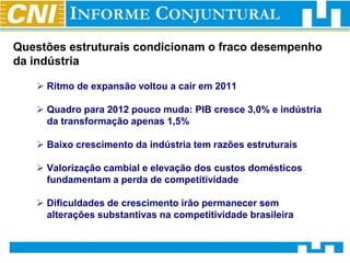 A economia brasileira deve crescer 3,0% em 2012, com a indústria da transformação expandindo apenas 1,5% devido a problemas estruturais, como a valorização cambial e custos altos. O consumo das famílias ainda será o principal motor do crescimento, enquanto o setor externo impactará negativamente em 1,0 ponto percentual. A expectativa é que a Selic permaneça em um dígito, com a inflação desacelerando, mas o crescimento das despesas do governo será menor que o planejado.