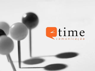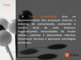 A Time Comunicação analisa as necessidades de comunicação das empresas, oferecendo soluções personalizadas em assessoria de imprensa, relações públicas, organização de eventos e comunicação interna. Sua equipe experiente possui know-how nos setores saúde e empresarial e bom relacionamento com a mídia. Os serviços incluem gestão de comunicação, assessoria, elaboração de conteúdo, organização de eventos, treinamentos, peças publicitárias e gestão de sites.
