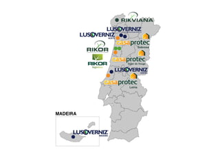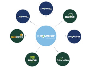 O documento fornece informações sobre o Grupo Lusoverniz, incluindo suas empresas (Rikor, Rikor Logistics, Lusoverniz Norte, Centro e Madeira, Casa Protec, Rikviana), produtos, valores, certificações e parceiros. O Grupo atua na produção e comercialização de tintas e vernizes em Portugal, Espanha e Moçambique.