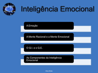 O documento discute a inteligência emocional, definindo-a como a capacidade de perceber, expressar e raciocinar sobre emoções. Argumenta que 80% do sucesso na vida é determinado pelo QE (Quociente Emocional) em vez do QI, e que é possível ser brilhante intelectualmente mas emocionalmente inapto. Também discute as componentes da inteligência emocional como a consciência emocional, regulação emocional e empatia.
