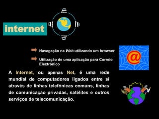 O documento descreve os principais conceitos e serviços relacionados à Internet. Apresenta a estrutura e protocolos da Internet, como o TCP/IP, e explica como a World Wide Web se diferencia da Internet. Também descreve os principais serviços disponíveis na Internet como correio eletrônico, transferência de arquivos, grupos de discussão e videoconferência.