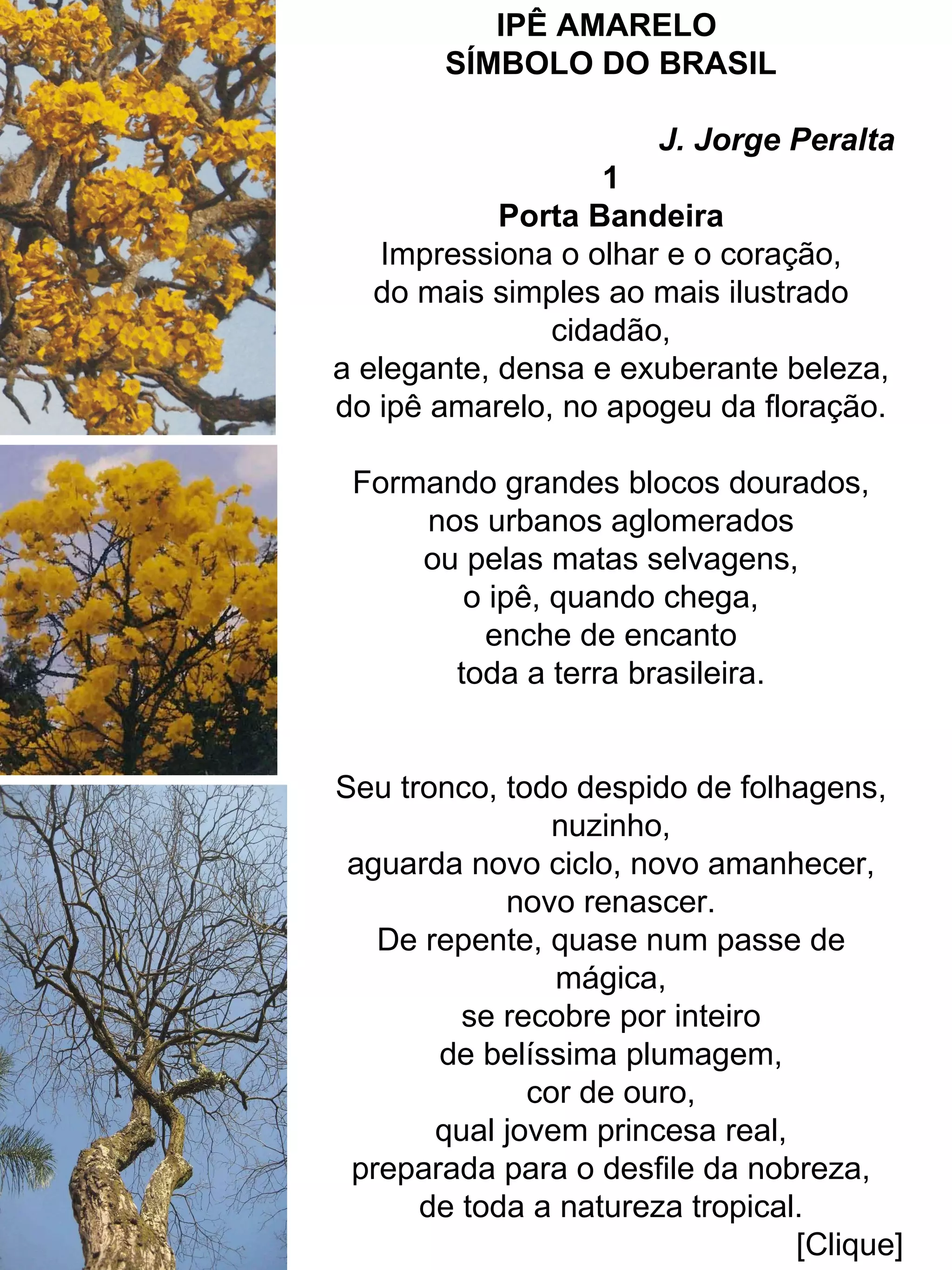 O texto descreve o ipê amarelo como um símbolo do Brasil. (1) Ele floresce em tons de amarelo, anunciando a primavera e a exuberância da natureza brasileira. (2) Por um mês, o ipê é a "rainha do pedaço", destacando-se entre as outras flores com sua beleza transitória. (3) Embora sua florada seja breve, o ipê permanece como a flor símbolo do Brasil tropical.