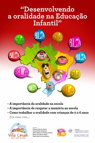 O documento discute a importância do desenvolvimento da oralidade na Educação Infantil, mencionando a importância da oralidade na escola, de resgatar a memória da criança e formas de trabalhar a oralidade com crianças de 0 a 6 anos de idade.