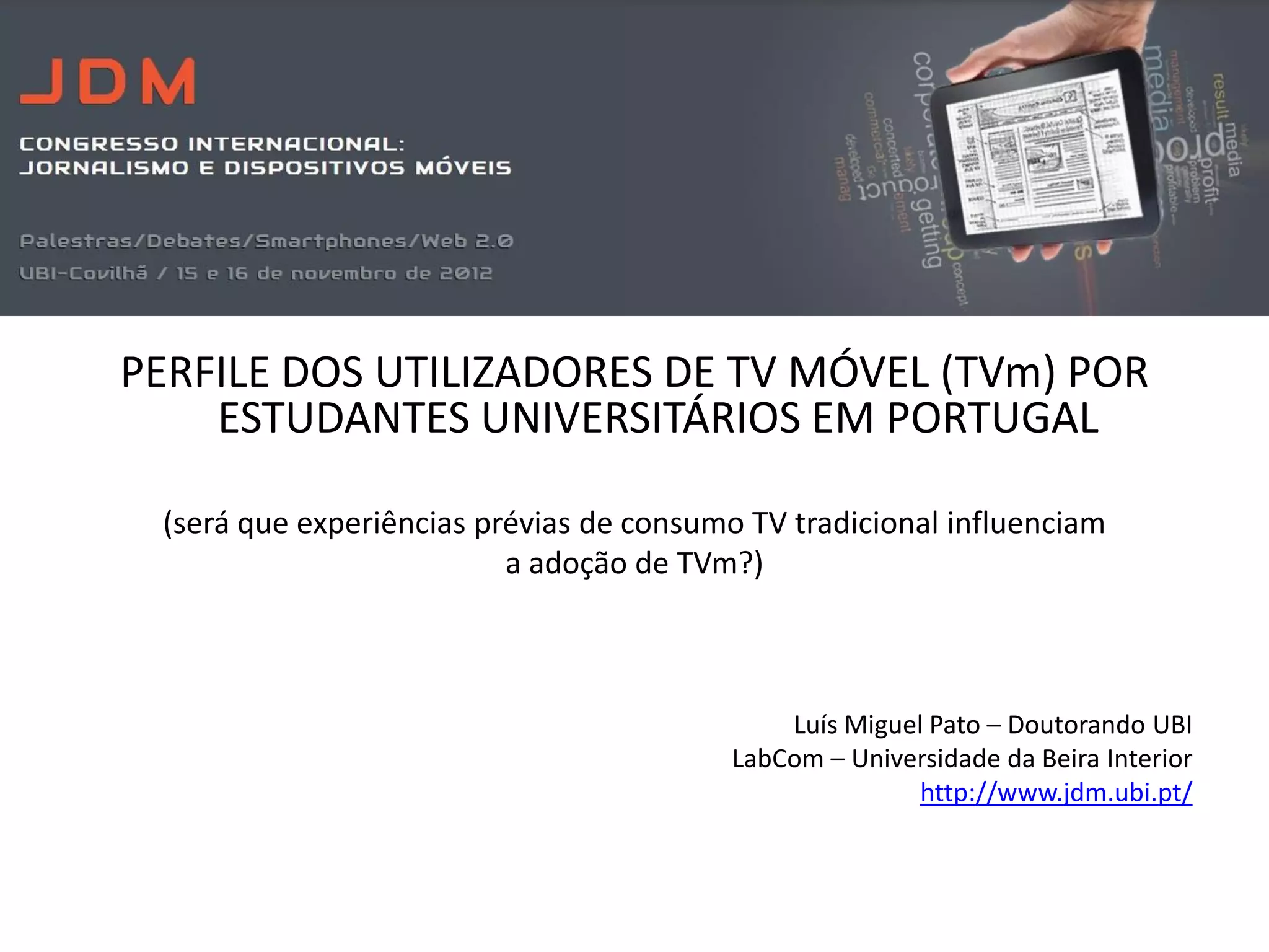 Este documento descreve uma pesquisa sobre o uso de TV móvel (TVm) por estudantes universitários em Portugal. A pesquisa encontrou que, embora a maioria dos estudantes tenha smartphones, o uso de TVm é ainda residual. Os estudantes preferem formatos de vídeo curtos em telas menores e citam problemas como tamanho da tela e qualidade de áudio como razões para não usarem mais a TVm. Apesar do desejo de personalizar a TV, a TVm ainda não se estabeleceu como forma predominante de acesso à televisão para