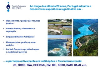 O documento discute a Parceria Portuguesa para a Água, uma iniciativa para internacionalizar o sector português da água. A parceria agrega mais de cem entidades portuguesas com experiência em áreas como gestão de recursos hídricos, saneamento, regulação e projetos hidráulicos. A parceria visa aproveitar as oportunidades de negócio em projetos financiados por instituições multilaterais, concentrando-se principalmente em África e América Latina.