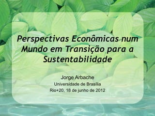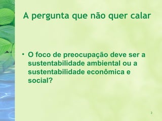 O documento discute como promover a sustentabilidade ambiental, econômica e social de forma conjunta. Apresenta os desafios de conciliar o crescimento econômico com a preservação ambiental, mas também as oportunidades de novas tecnologias que explorem sinergias entre ambos. Defende políticas públicas que eliminem o conflito entre crescimento e meio ambiente e incentivem práticas sustentáveis.