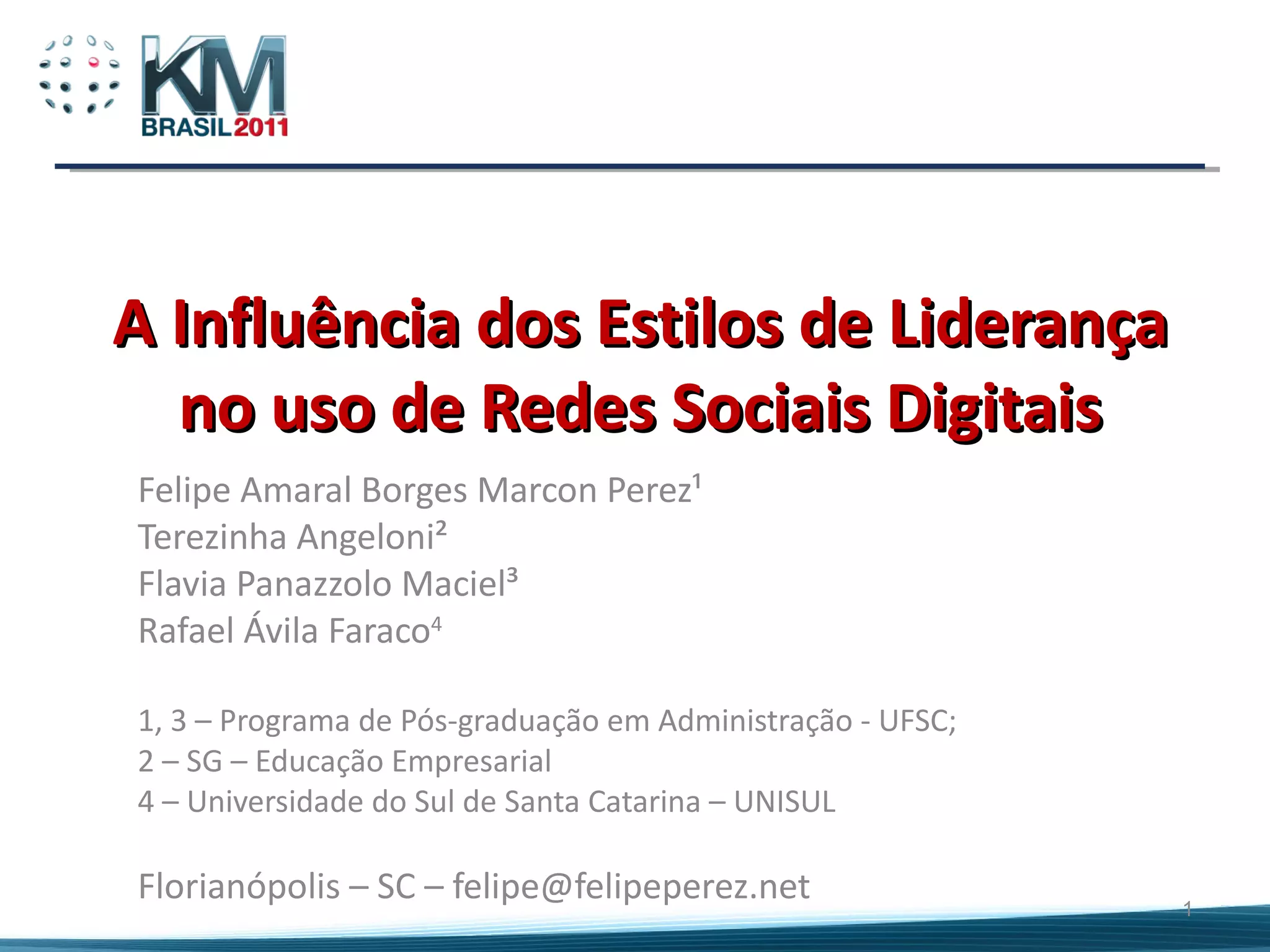 O documento discute a relação entre estilos de liderança e uso de redes sociais digitais em organizações incubadas. Mostra que os líderes têm estilos autoritários, mas as redes sociais são amplamente usadas. Embora haja regras rígidas, as redes sociais permitem comunicação que contorna restrições. Isso pode subverter normas, mas organizações muito hierárquicas podem não aproveitar todos os benefícios das redes sociais.