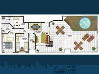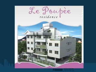O documento descreve um empreendimento imobiliário chamado Le Poupèe Residence localizado em Mar de Jurerê. O condomínio contém apartamentos com 4 unidades por andar e coberturas com 2 unidades no pavimento superior, todos com hidrômetros individuais, revestimentos em porcelanato e sistema de ar condicionado split nos quartos, além de aquecimento a gás e de água.